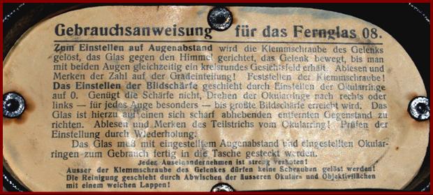 My WWI German military binoculars are of the ubiquitous pattern issued to all non commissioned officers and are marked “ F.G. 08 ” (Fernglas 08 or binoculars [model] 08), and are marked “ K.B Dienst ” ( K.B. Govt Service property?) and also “ J ” (Bavarian acceptance mark of Geschofabric Ingolstadt) and also “ IX14 ” (production date of September 1914) on the pivot arms. These binoculars are also maker marked “ G. Rodenstock Fernglas 08 No. 7676 Munchen ” on the pivot disk. The case is marked as having been made by “ Emil Busch A.G. Rathenow” (camera maker) and has the normal case lid instructions, which are quite faded. . |